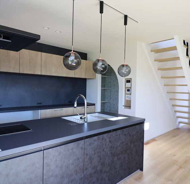 半アーチ型の下がり壁や、木目を活かしたダイニングの天井