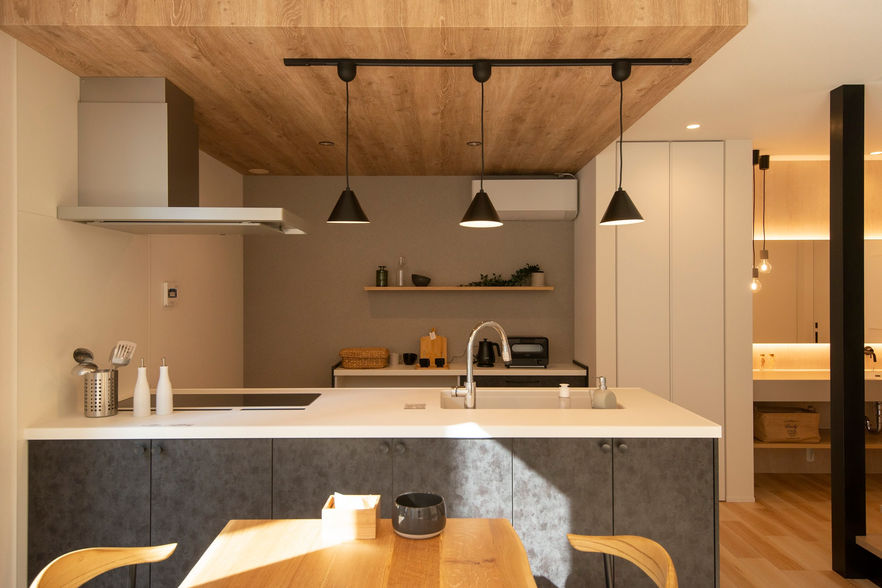 キッチンには温かみのある木目天井を採用し