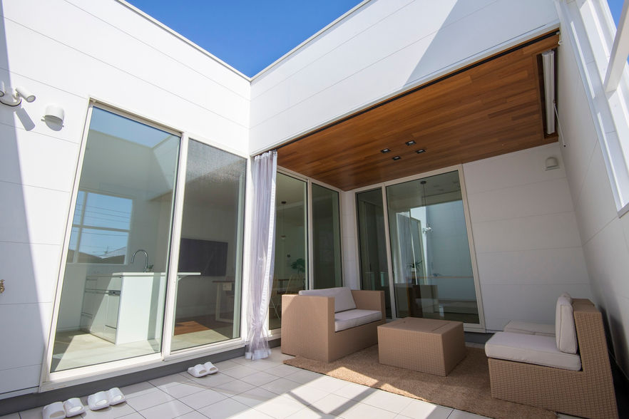 真っ白な空間の中にアジアンリゾートを連想させる 赤みがかった木をメイン素材とし 清潔感のある白い大理石調のタイル 南国のヴィラ(別荘)を彷彿させる住まいです。
